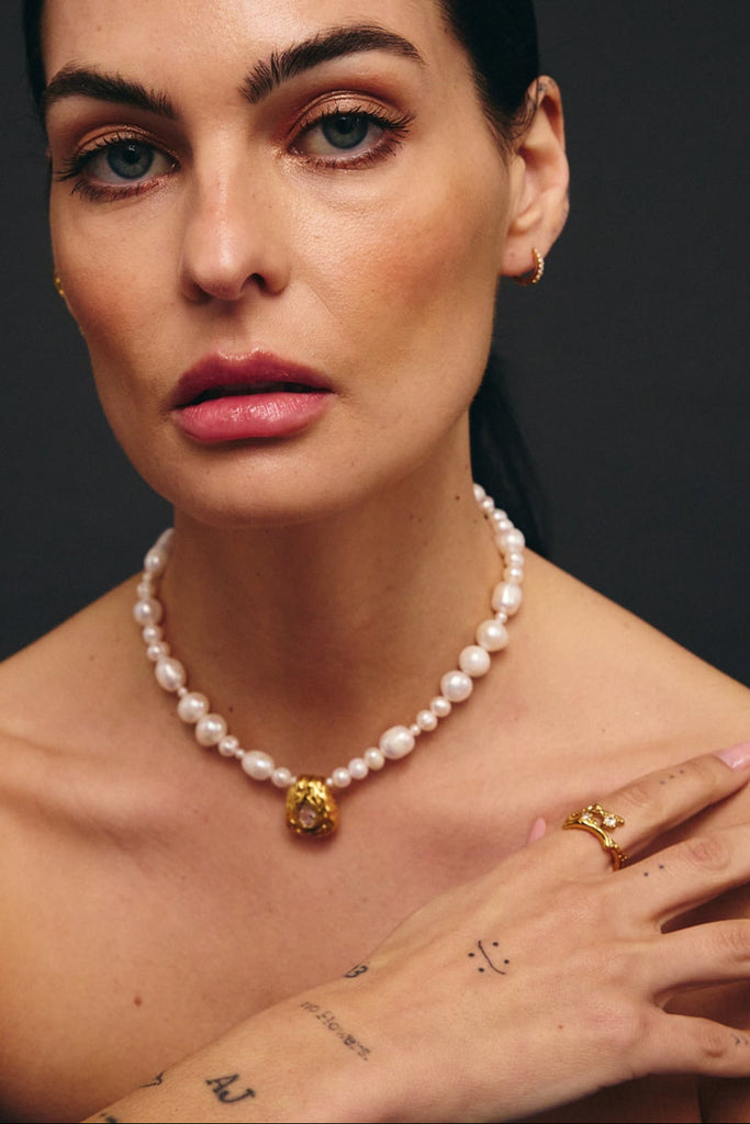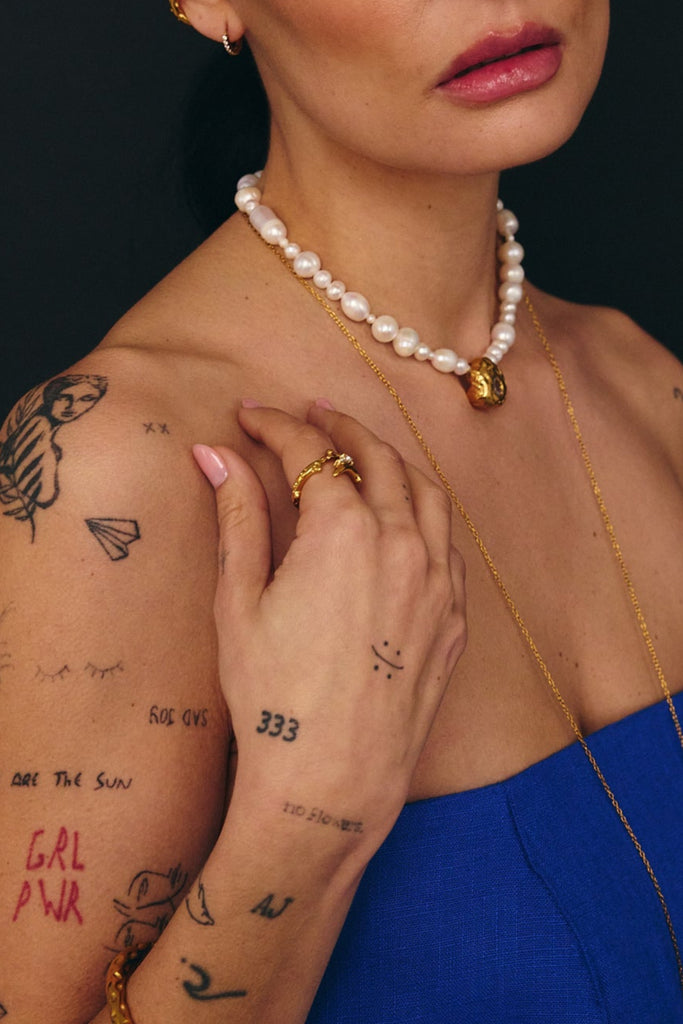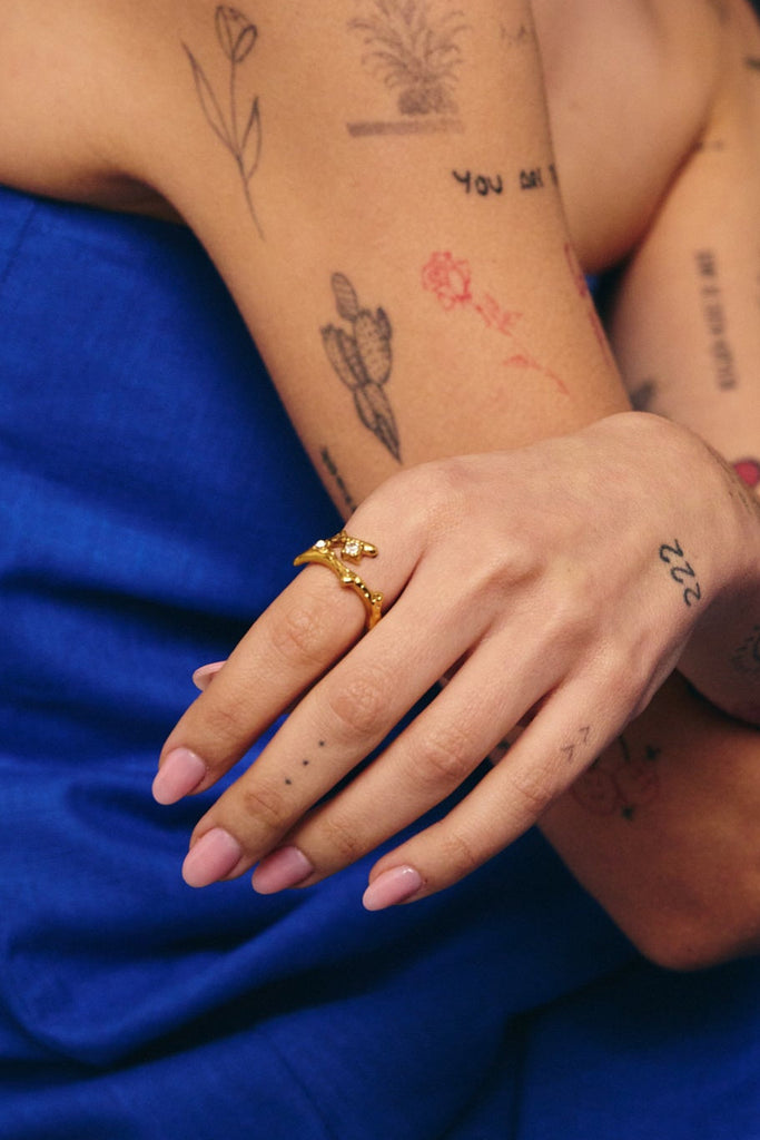 Anel rígido, não ajustável, com forma orgânica e duas zircónias brancas.