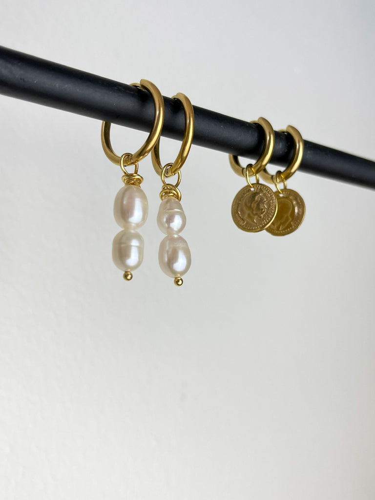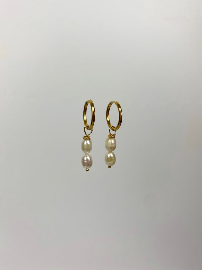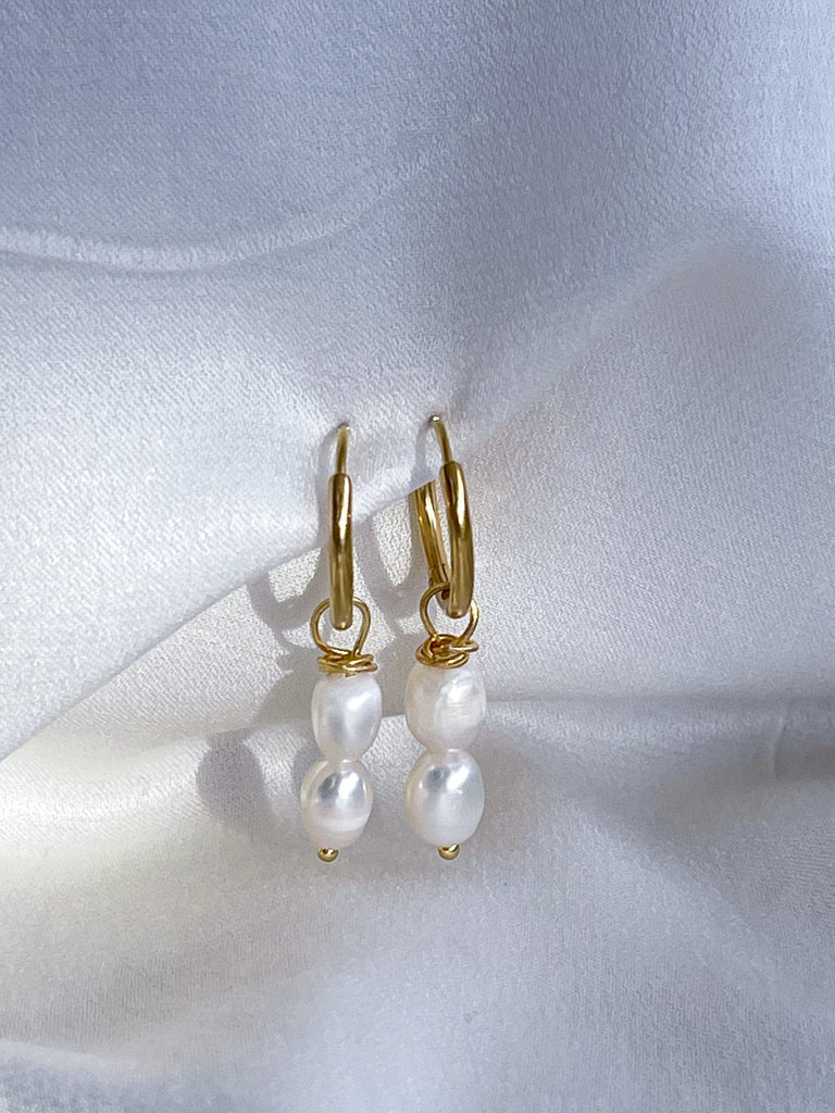 Argolas com pendente de duas pérolas e fecho de pressão.
