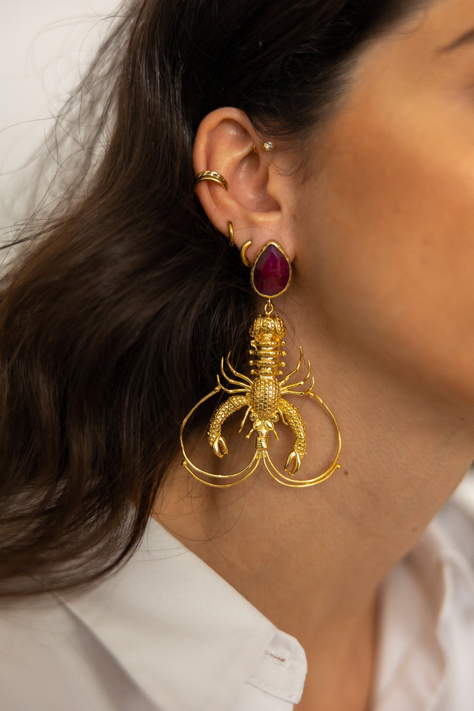 Brincos em forma de lavagante com pedra semi-preciosa.