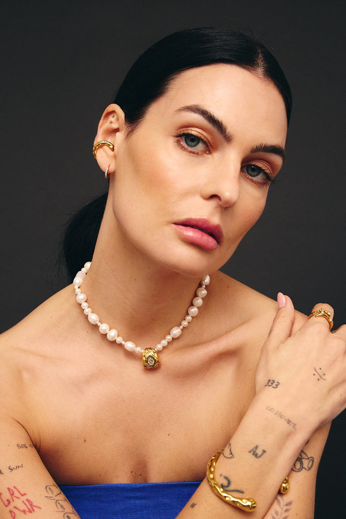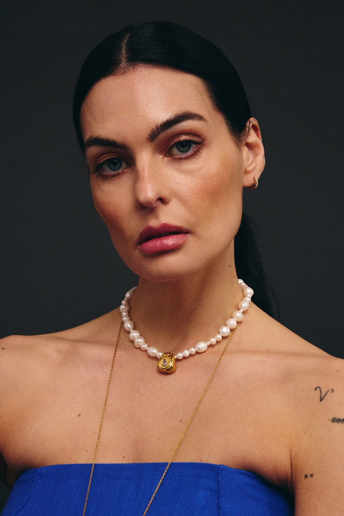Colar assimétrico em pérolas naturais de água doce com pendente com zircónia branca.