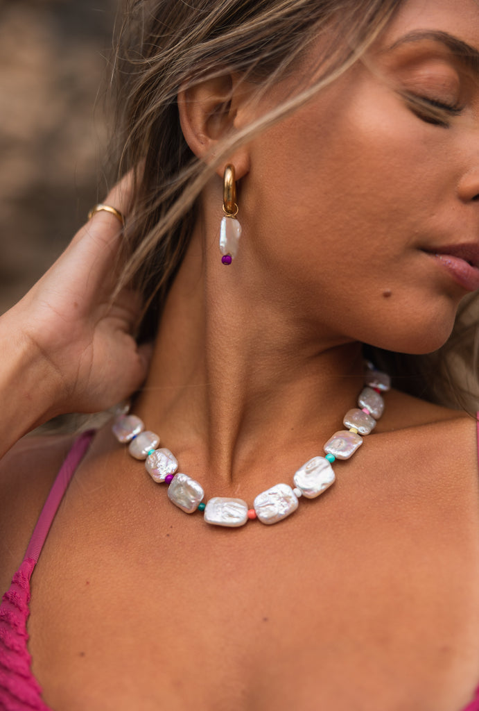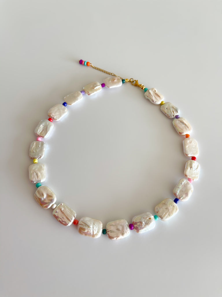 Colar de pérolas de água doce em formato rectangular intercaladas por missangas coloridas.