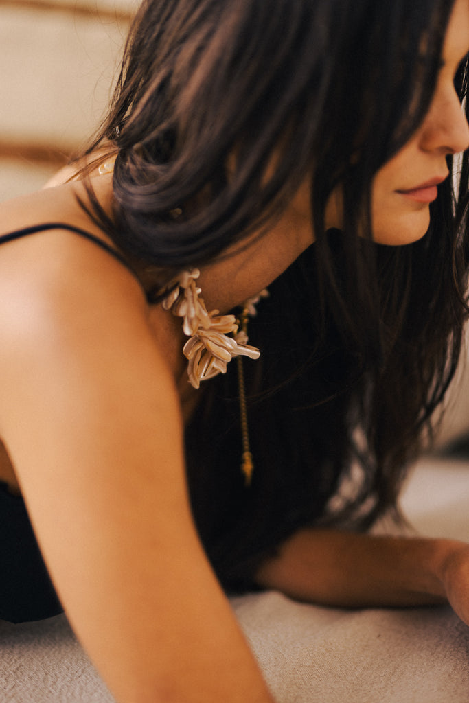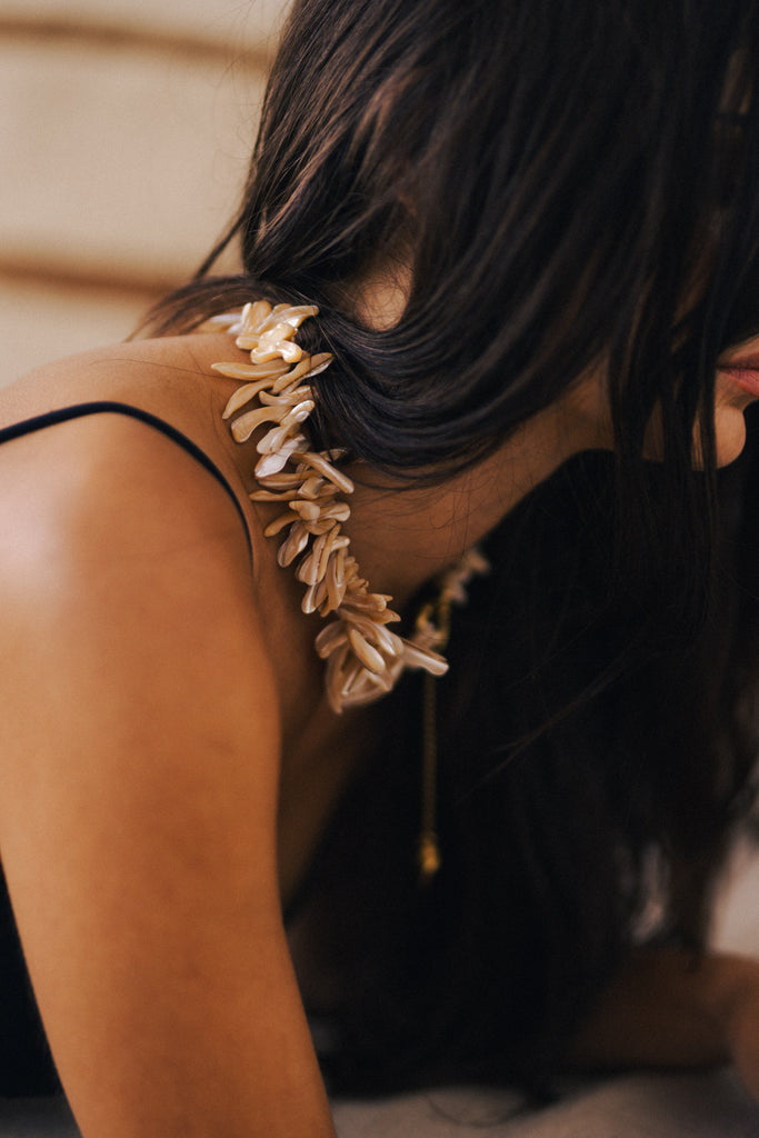 Colar de madrepérola irregular com pendente com búzio extraível. Pode utilizar-se com o fecho para a frente ou para trás.