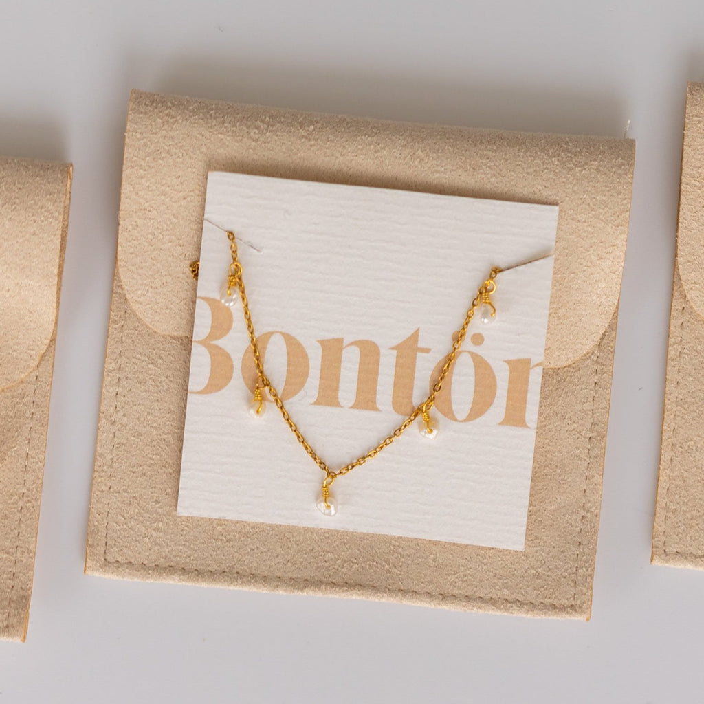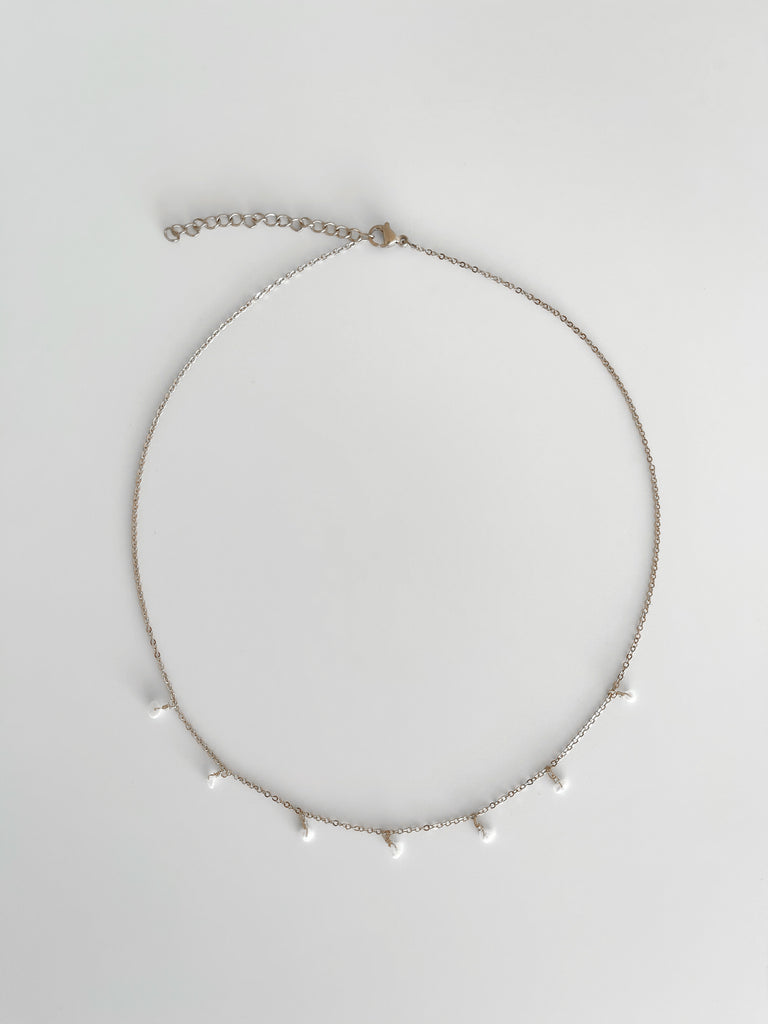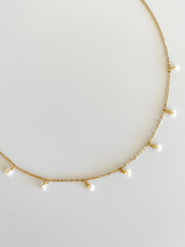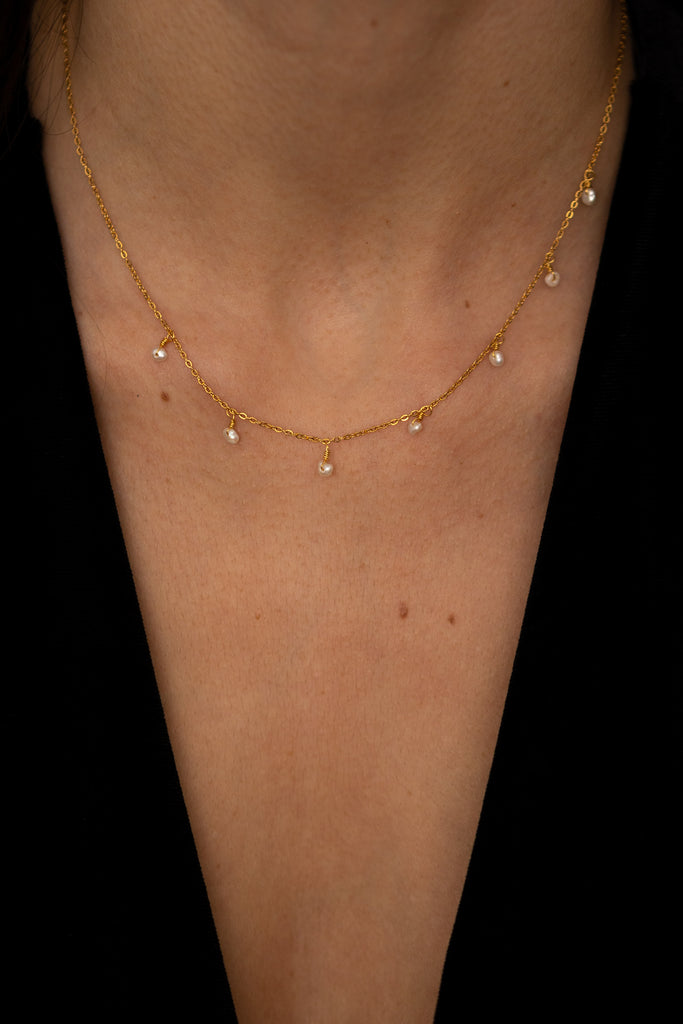 Colar de malha fina com 7 pérolas pendentes.