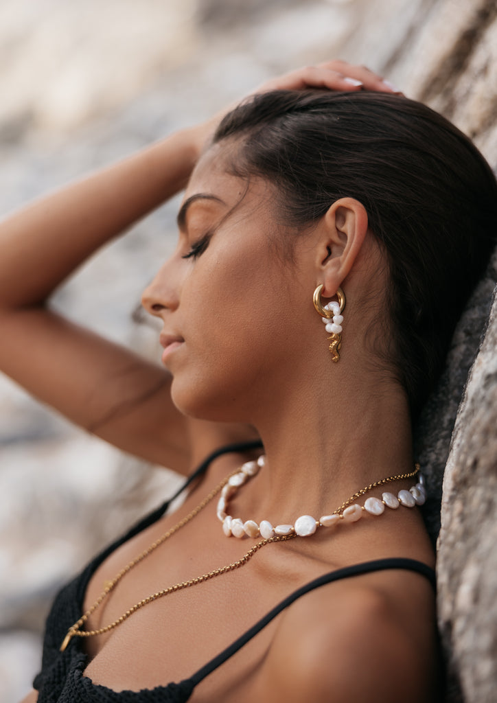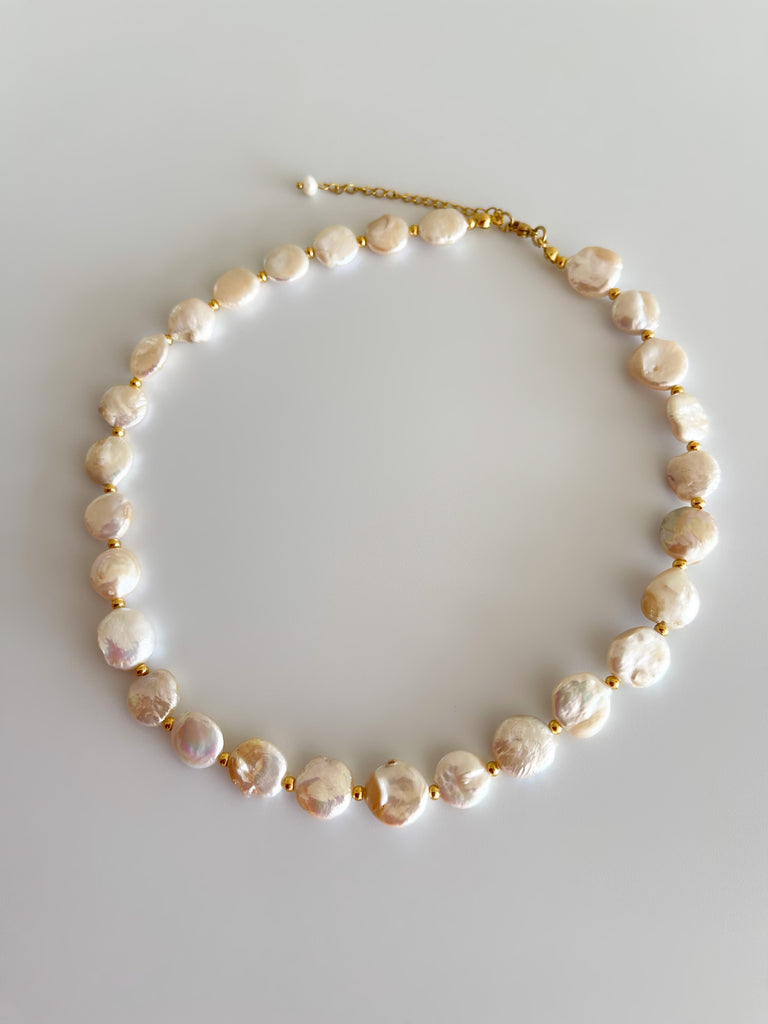 Colar com pérolas naturais de água doce, alternadas por mini contas douradas em aço inoxidável.