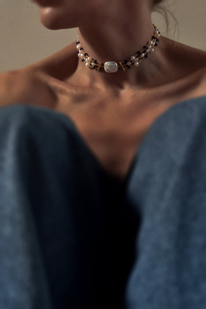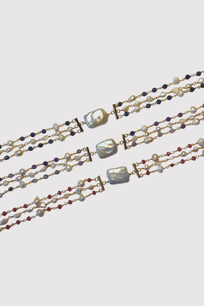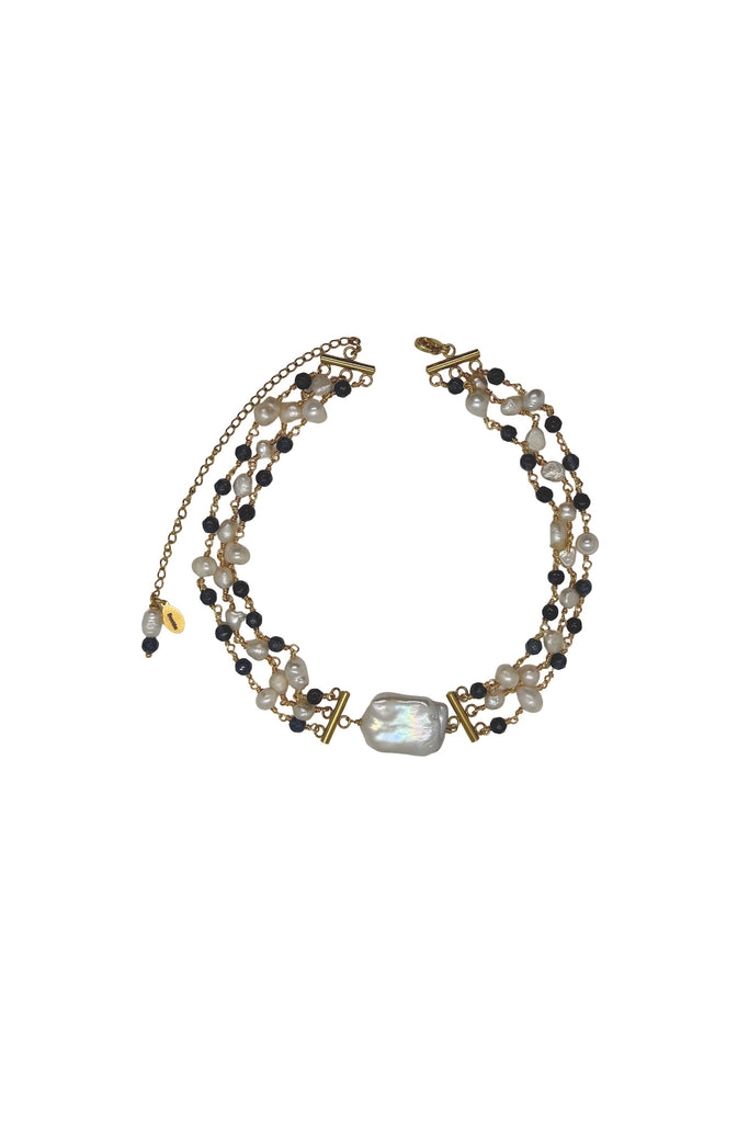 Malha em ródio com pedras naturais. Pérola natural de água doce. Terminais em aço inoxidável